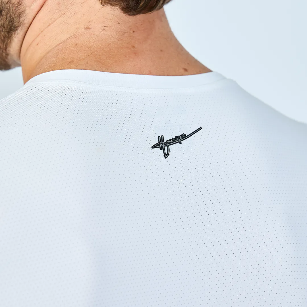 A Camiseta Prime White foi desenvolvida em parceria com o atleta Henrique Medeiros, um dos jovens talentos em ascensão do beach tennis brasileiro. O modelo traduz a intensidade e a evolução constante de quem vive o esporte em alto nível.