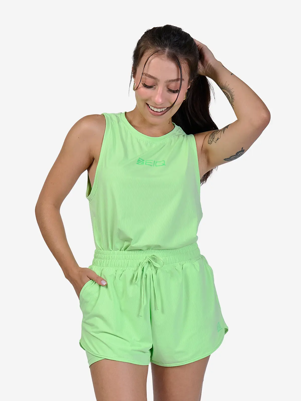O short interno possui média compressão, proporcionando melhor ajuste ao corpo, sustentação e liberdade de movimento. Já o tecido externo, com 90% poliamida e 10% elastano, é leve e respirável, garantindo ventilação e conforto durante a atividade.